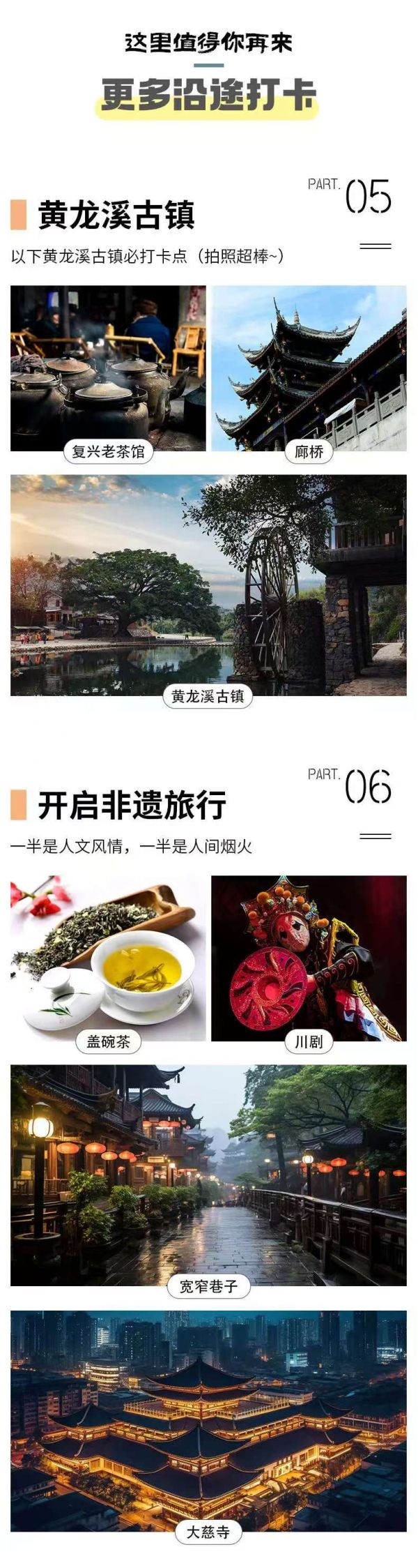 如果時(shí)間充裕,您【成都特色美食】有火鍋、缽缽雞、糖油果子、鐘水餃、龍抄手、紅糖鍋盔、還有各類“蒼蠅館子”,五花八門,色味俱佳,來之前一定要做足功課!成都飲食偏麻、辣,一定注意不要暴飲暴食、吃太辣致腸胃不適。