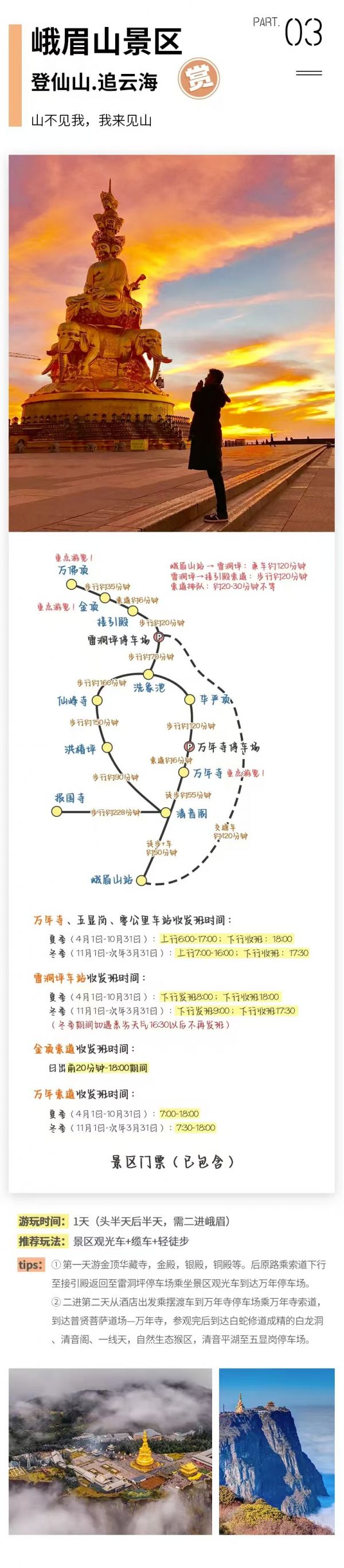 峨眉山觀光車90元/人(必須)、金頂索道上行65元/人(必須)+下行55元/人(建議)、萬(wàn)年寺索道上行65元/人(必須)、普賢菩薩道場(chǎng)-萬(wàn)年寺10元/人(必須);