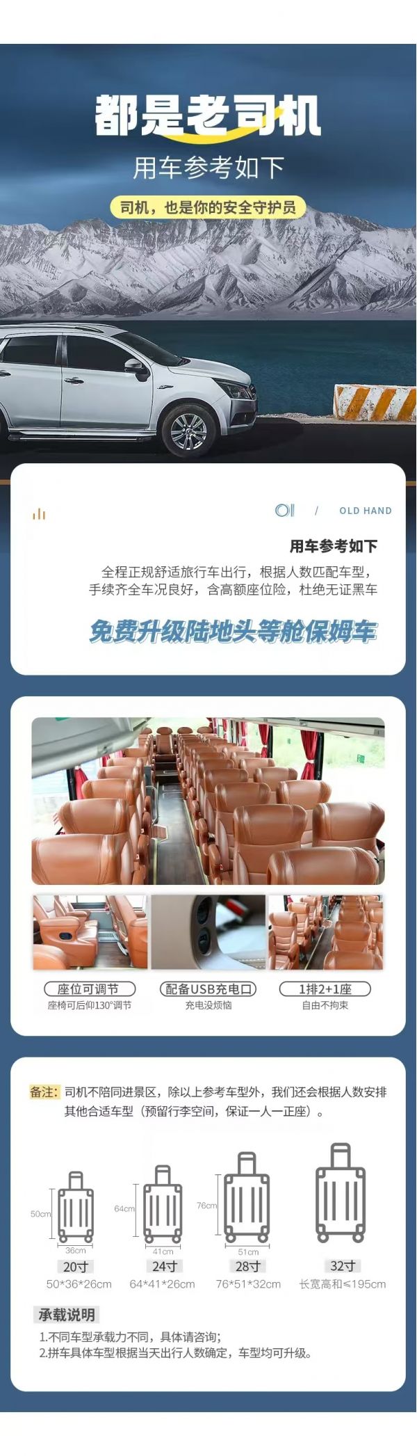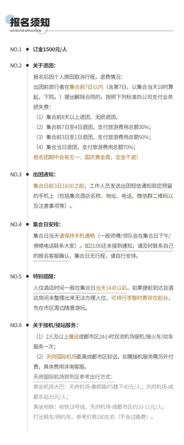 注意事項(xiàng):出發(fā)前一天晚上18:00-22:30通知接你的具體時(shí)間,請(qǐng)務(wù)必保持電話暢通(接早的時(shí)間根據(jù)師傅線路決定,為保障整個(gè)團(tuán)隊(duì)的順利出行請(qǐng)注意配合時(shí)間安排,感謝理解)