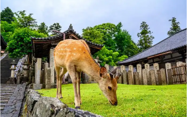 【奈良鹿公園】(約40 分鐘)奈良公園位于奈良東部、春日山腳下,占地面積為 8 平方公里。奈良人深信祖先是騎著鹿而來的,所以對鹿相當崇敬,奈良公園內(nèi)就有 1200 多頭受市政府保護的野生梅花鹿隨意漫步,游人來到這里也能夠和 它們親密接觸。園內(nèi)到處都有售賣“鹿餅”的攤販,只要游客的手中拿有鹿餅,就會立刻被許多鹿環(huán)繞其中,感覺非常 奇特。春季嫩枝發(fā)芽櫻花綻放、秋季滿園楓葉的奈良公園都令人心曠神怡,而在其他季節(jié)也很適合悠閑自在地漫步。