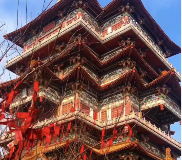 寺內(nèi)建筑恢弘大氣,采用盛唐風(fēng)格,以“八殿、兩閣、一院”布局。其中,七佛殿是中國(guó)最大的大雄寶殿,壁畫精美絕倫;通天閣高達(dá)59.88米,供奉著39.88米高的中國(guó)最大室內(nèi)鍛銅佛像天冠彌勒,氣勢(shì)磅礴。