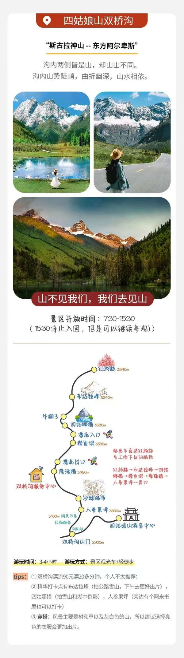 因雙橋溝有限流要求,如遇票滿,我們將更換安排海子溝和長坪溝的門票,以上兩個(gè)景點(diǎn)也同屬四姑娘山。