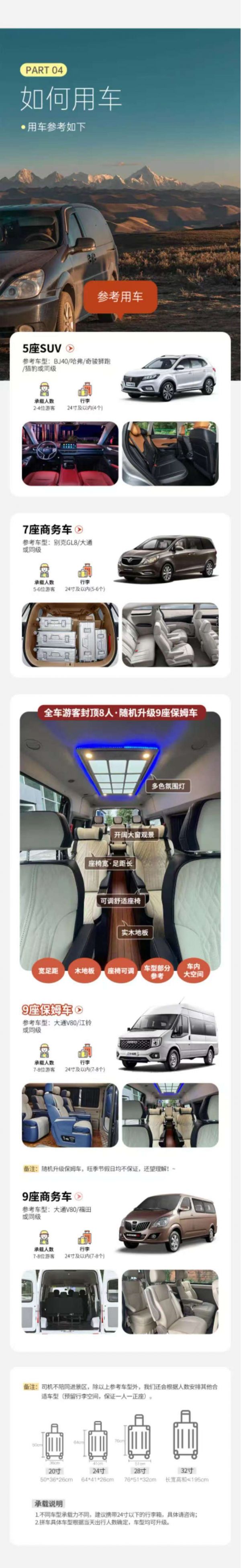 為保證成團(tuán)及質(zhì)量,根據(jù)人數(shù)派不同座位數(shù)用車,保證每人一正座;