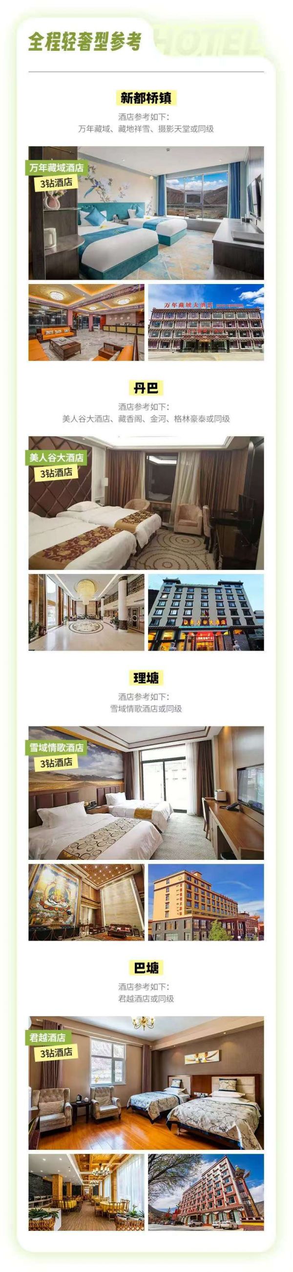 行程所列住宿地5晚住宿(輕奢型和豪華型酒店任選其一,具體價格詳情查看團期價格或咨詢客服了解詳情),每人1床位(含成都集合日4鉆酒店1晚、不住不退不換不指定)具體了解團期價格。