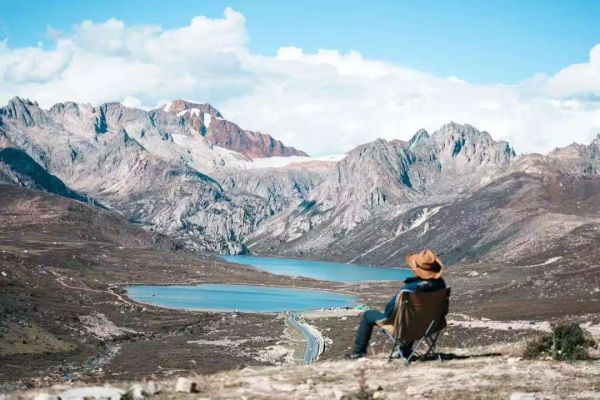 離開措普溝,途徑海子山姊妹湖。姊妹湖由兩個相連的湖泊組成,湖水湛藍清澈,宛如兩顆璀璨的明珠鑲嵌在雪山腳下。站在觀景臺上,可俯瞰到姊妹湖的全貌,周圍是連綿的雪山和廣袤的草原,景色壯美。在此拍照留念,記錄下這令人震撼的美景。