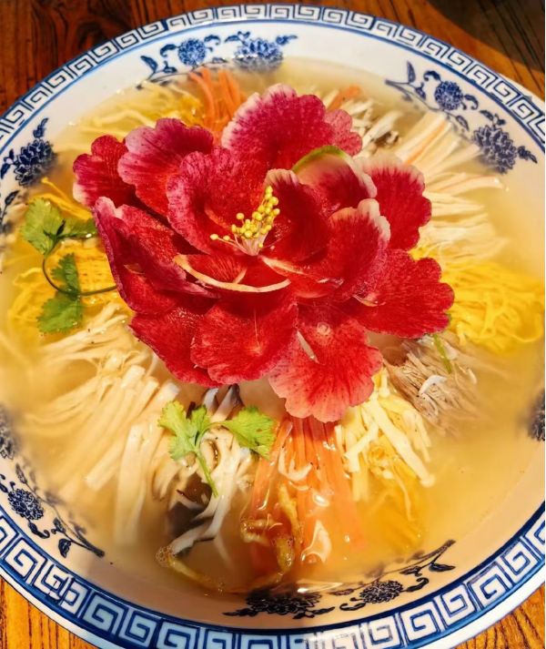 菜品特色:造型別致,盛開的“牡丹”浮于湯面,色彩絢麗;口感豐富,蘿卜絲軟嫩爽滑,有“燕窩”的質感,各種配菜味道醇厚鮮美,湯汁酸辣開胃,兼具觀賞性與美味度,體現(xiàn)了洛陽飲食文化的深厚底蘊。