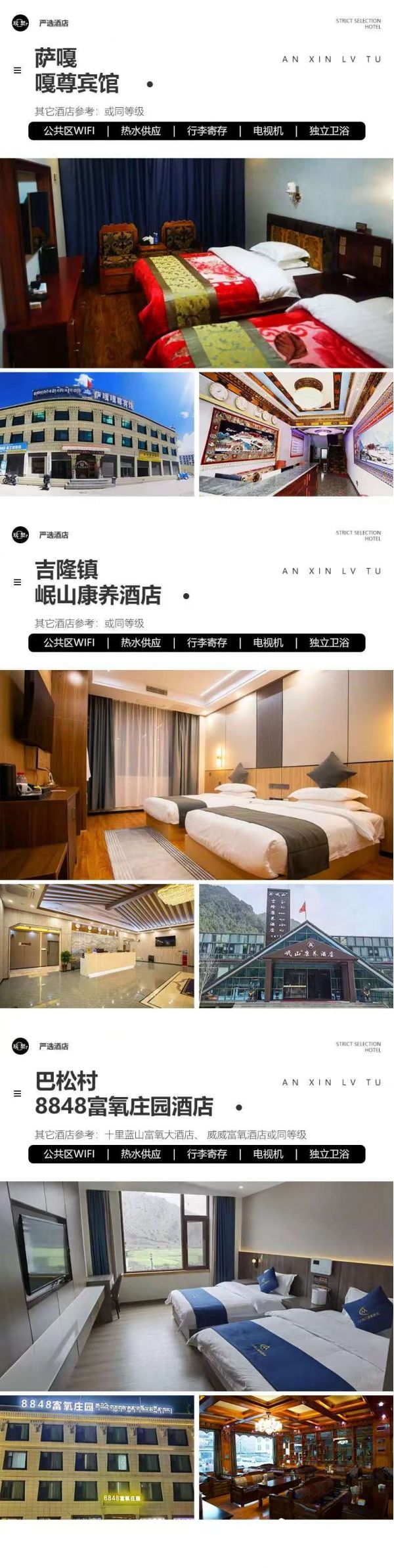 巴松村:8848富氧莊園酒店、十里藍山富氧大酒店、 威威富氧酒店或其它同級酒店(阿里地區(qū)住宿條件艱苦,無法和城市相比)