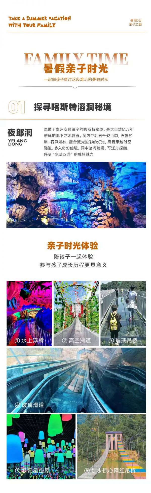 上午:酒店早餐后乘車(chē)前往探洞【夜郎洞】(成人兒童均已包含景區(qū)內(nèi)套票:水上浮橋—高空滑道—玻璃吊橋—玻璃滑道—夢(mèng)幻星空屋—步步驚心網(wǎng)紅橋),隱匿于貴州安順鎮(zhèn)寧的喀斯特秘境,是大自然億萬(wàn)年雕琢的地下藝術(shù)宮殿。洞內(nèi)鐘乳石千姿百態(tài),石幔如瀑、石筍如林,配合流光溢彩的燈光,宛若穿越時(shí)空隧道,步入奇幻仙境。洞中暗河蜿蜒,可泛舟探幽,感受“水陸雙游”的獨(dú)特魅力。還有各項(xiàng)體驗(yàn)項(xiàng)目: