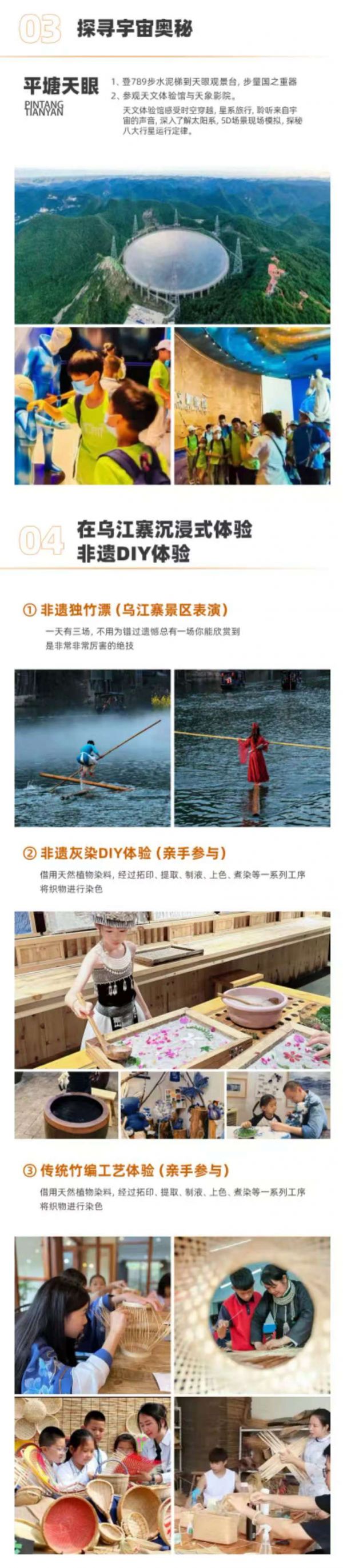 上午:酒店早餐后乘車(chē)前往游覽【中國(guó)天眼】景區(qū)(成人兒童均不含景區(qū)擺渡車(chē)50元/人、必須消費(fèi)項(xiàng)目,敬請(qǐng)自理,兒童超過(guò)1.2米含1.2米需補(bǔ)景區(qū)套票60元/人)天眼口徑有500米,有近30個(gè)足球場(chǎng)大的接收面積,主反射面的面積達(dá)25萬(wàn)平方米。當(dāng)你真正走近中國(guó)天眼,才能感受到這個(gè)人工建筑的廣闊與巍峨,驚嘆人類的巧奪天工。只有綜合國(guó)力強(qiáng)大的國(guó)家才能有實(shí)力建造出如此浩大的工程,不由得心生一股國(guó)家自豪感。中國(guó)天眼科普基地所售的【套票包含F(xiàn)AST觀景臺(tái)、天文體驗(yàn)館和天象影院】,大多游客的游覽路線是含F(xiàn)AST觀景臺(tái)—天文體驗(yàn)館—天象影院,順著“上山—下山”的順序游覽,十分清晰明確。