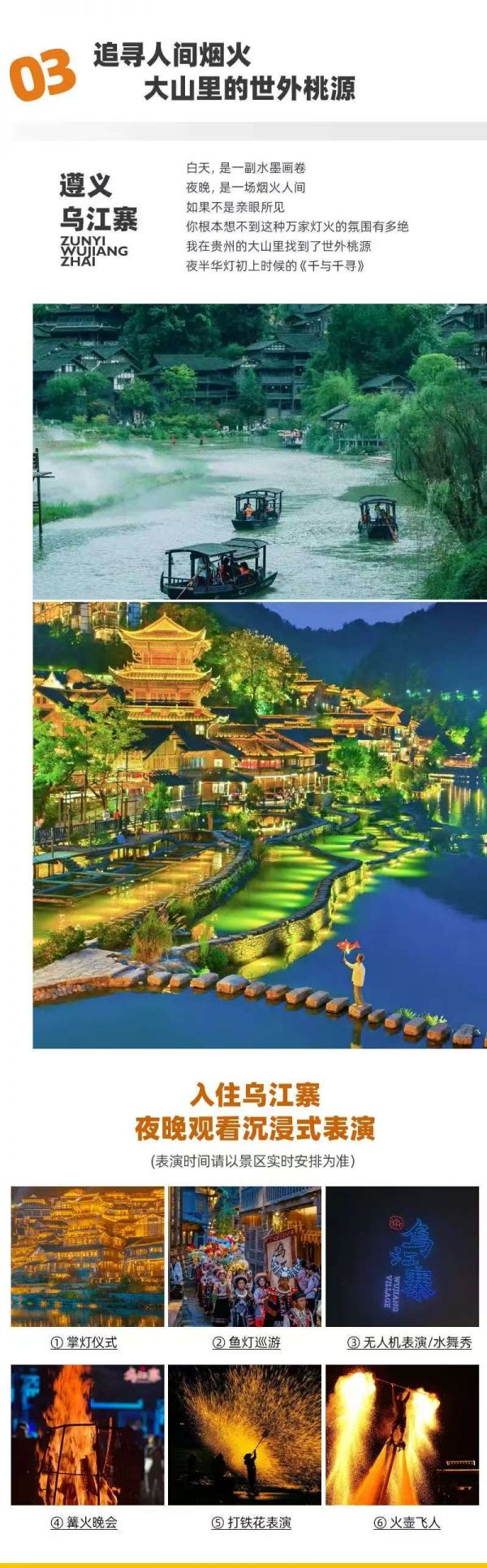 入住烏江寨。沉浸式表演之夜(以景區(qū)實(shí)時(shí)安排為準(zhǔn)):