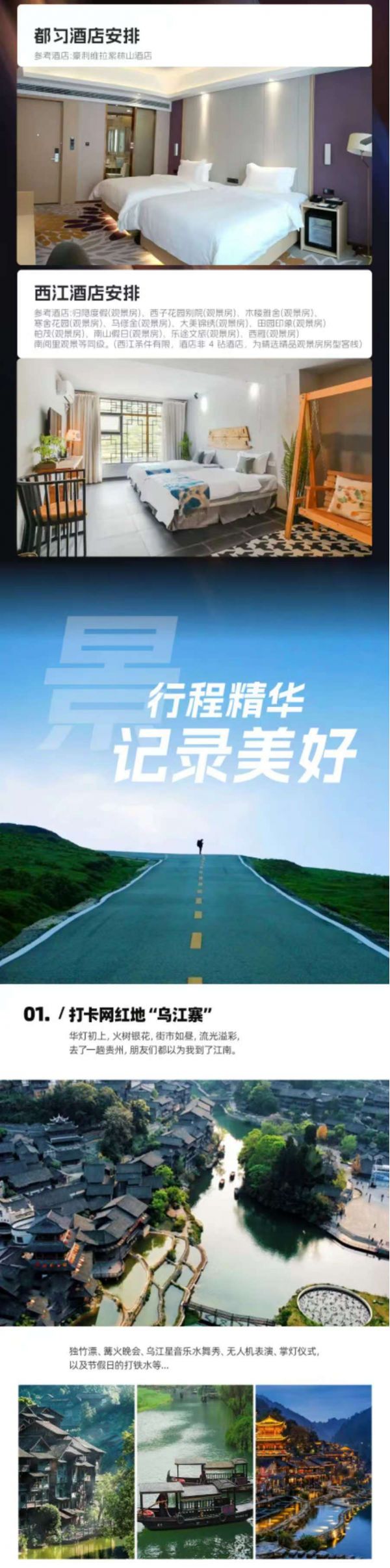 下午:午餐后乘車前往【烏江寨】國(guó)際旅游度假區(qū),車程約2.5H(景區(qū)電瓶車已包含,不限次數(shù)乘坐),江南千條水,云貴萬(wàn)重山,一灣烏江碧水飄落在山間,如黛青山擁簇著烏江寨,兩岸吊腳樓錯(cuò)落有致,滿滿的黔北風(fēng)情,宛若治愈力拉滿的世外桃源,青山、綠水、吊腳樓、青磚黛瓦、民居、民俗、水舞秀...描繪出一幅黔北民居群落的壯美畫(huà)卷,在太乙閣碼頭坐上一艘搖櫓船,穿行在氤氳水汽之間,鱗次櫛比的吊腳樓撲面而來(lái),斜倚船頭,坐看云煙升騰,晨光下的美景猶如一幅水墨畫(huà)在眼前暈染開(kāi)來(lái)。景區(qū)是集觀光、休閑、度假、康養(yǎng)、會(huì)展為一體的大型綜合業(yè)態(tài)的旅游目的地。景區(qū)內(nèi)辦理入住酒店后自由游覽,晚上景區(qū)內(nèi)可以欣賞震撼壯觀的水舞秀、燈光秀、獨(dú)竹飄,無(wú)人機(jī)編隊(duì)表演等。
