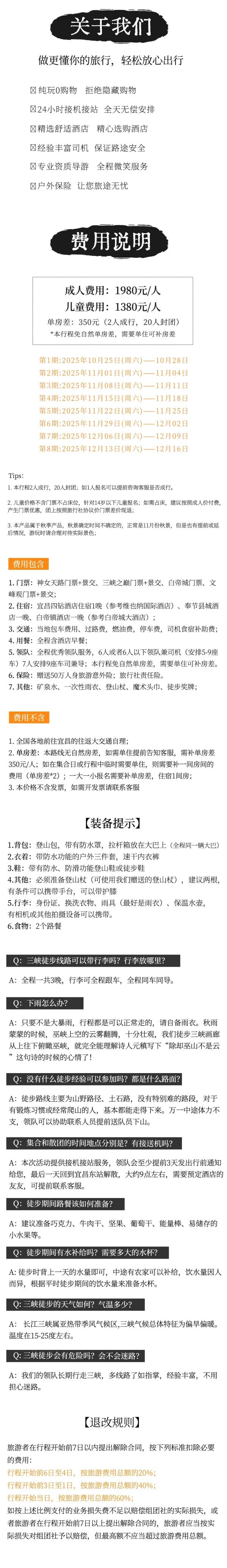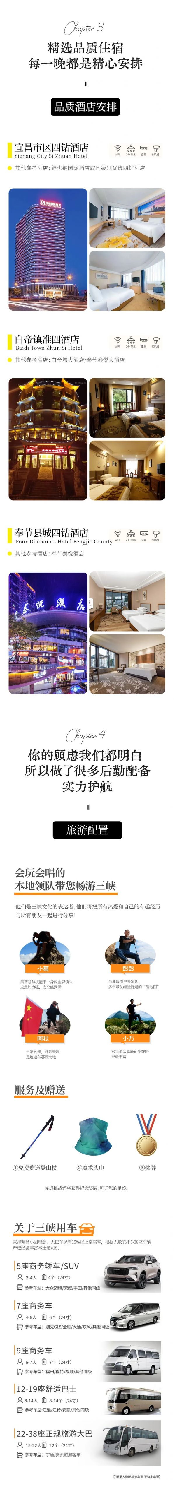 A:本次活動提供接機(jī)接站服務(wù),領(lǐng)隊(duì)會至少提前3天發(fā)出行前通知給您,最后一天回到宜昌東站解散,大約9點(diǎn)左右,需要預(yù)定酒店的友友,可提前聯(lián)系客服