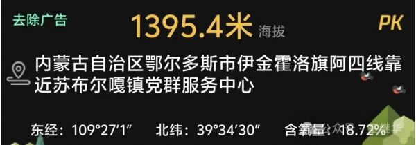 今天早晨起床搜百度這里海拔1395.4米在內蒙古自治區(qū)鄂爾多斯市伊金霍洛旗阿四線靠近蘇布爾嘎鎮(zhèn)黨群服務中心東經(jīng):109°27'1”北緯:39°34'30"含氧量:18.72%