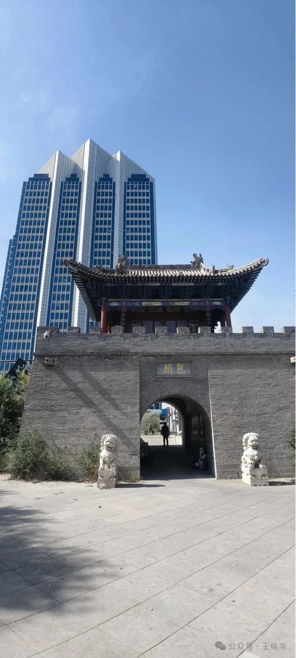 指著前景的古包頭城門與背景的高樓說笑:“你看這新的舊的擠在一塊兒,倒比單看哪樣都有意思。”