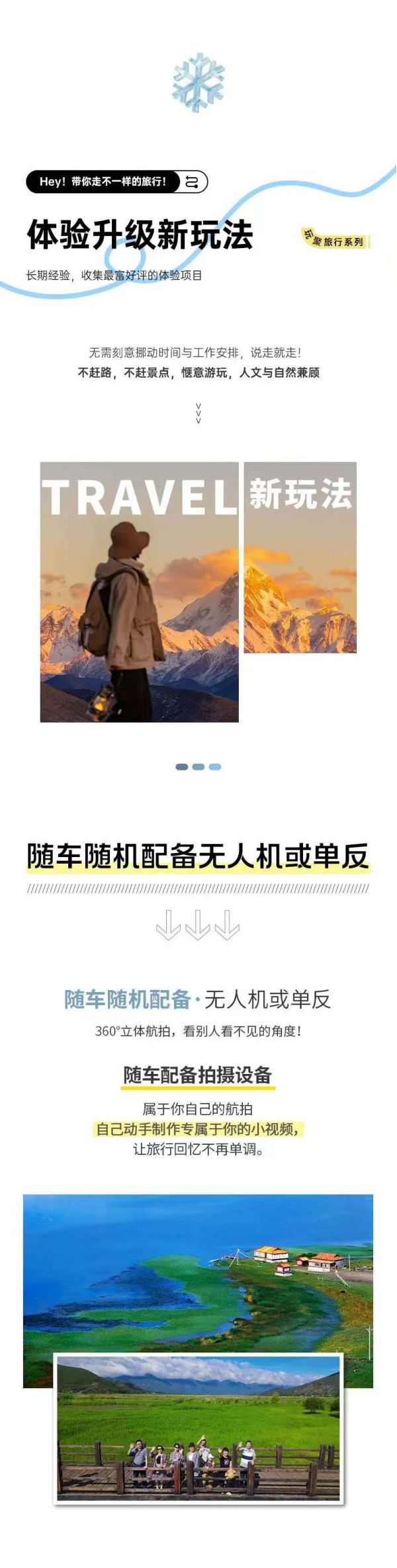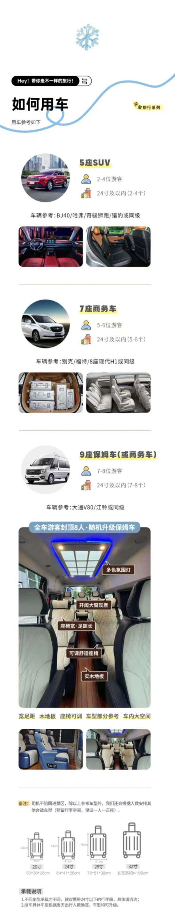用車:2-8人VIP小團(tuán)為保證成團(tuán)及質(zhì)量,根據(jù)人數(shù)派不同座位數(shù)用車,保證每人一正座;包含司機(jī)一名、油費(fèi)、:過路費(fèi)、停車費(fèi),包含從出發(fā)地到景點(diǎn)及酒店費(fèi)用,不包含晚間自由活動(dòng)交通;2-4位游客:乘坐5座SUV;5-6位游客:乘坐7座商務(wù)車;7-8位游客:乘坐9座商務(wù)車(或隨機(jī)升級9座保姆車)備注:車型承載力有限,攜帶行李為24寸或以下行李箱。*隨車隨機(jī)配備無人機(jī)或單反(不指定);(節(jié)假日不保證團(tuán)團(tuán)配備)。