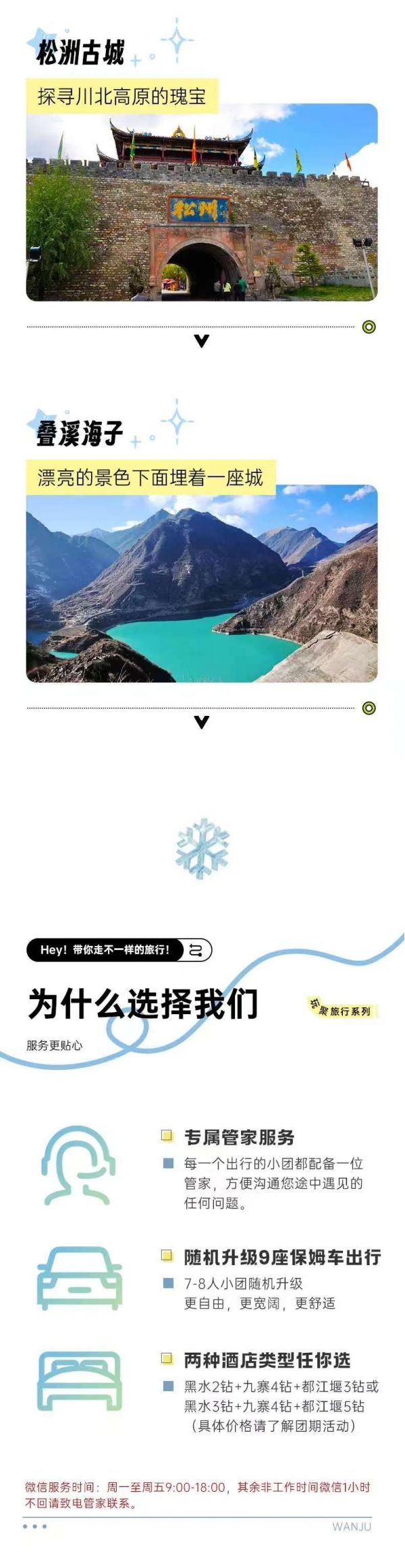 2. 由于川西地區(qū)路況復(fù)雜,山道狹窄,有可能因?yàn)槎萝嚩l(fā)生延誤,請大家盡量預(yù)定第二天返程的航班或車次。