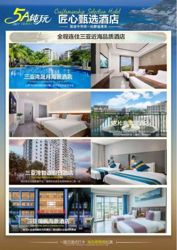 *酒店安排:三亞灣晟月海景酒店園景房/這片海海景酒店豪華房/三亞御楓海景酒店甄享房/三亞灣智選假日酒店/三亞凱瑞萊海景度假酒店園景房或同級