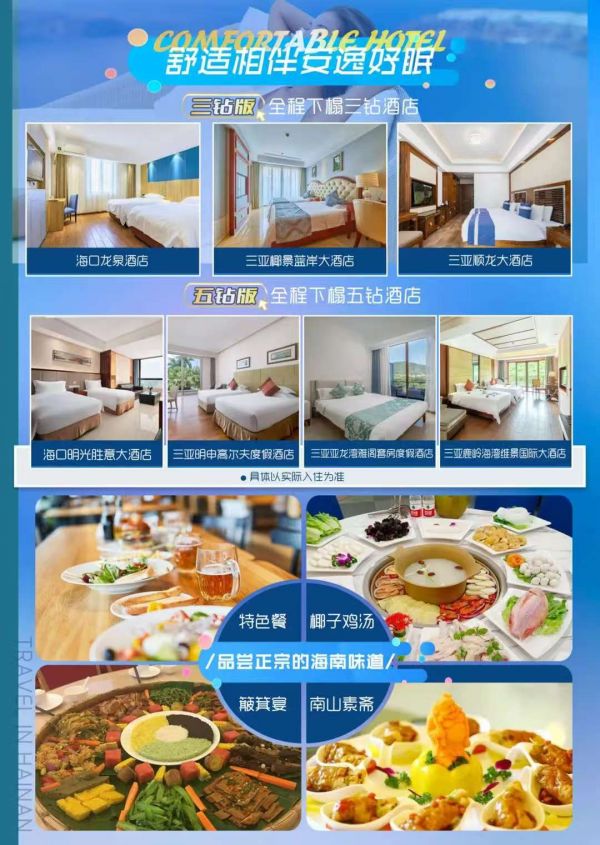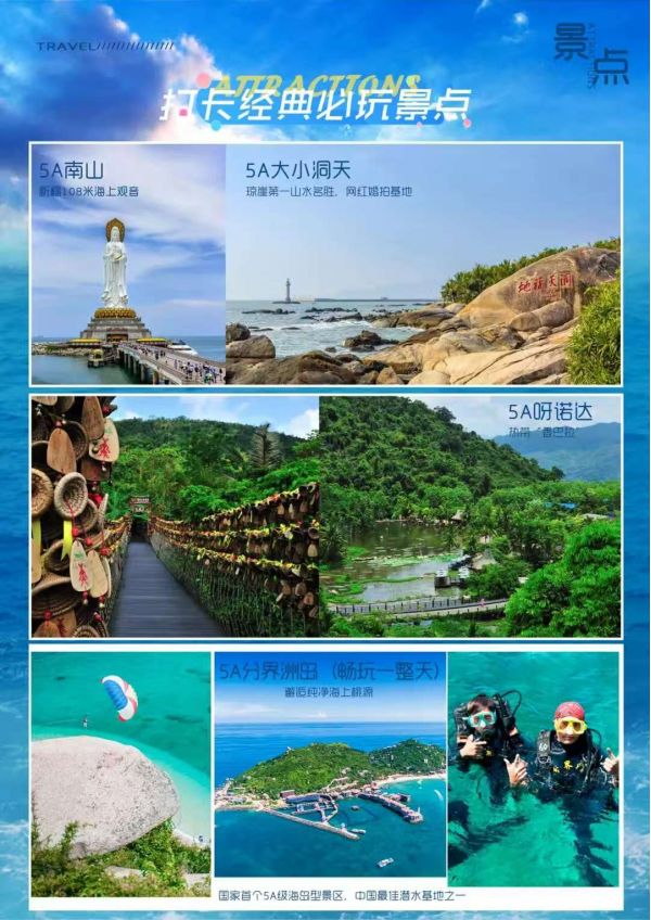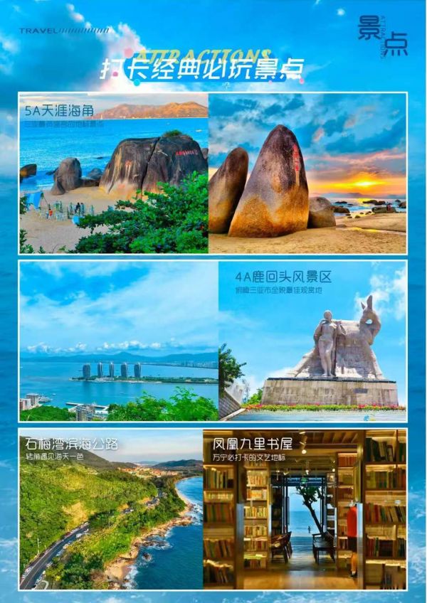 【大小洞天】國(guó)家5A級(jí)景區(qū)(時(shí)間不少于120分鐘):至今已有800多年歷史。大小洞天融匯了秀麗的海景、山景和石景,既可以看到“小洞天”、“海山奇觀(guān)”、“仙人足”等摩崖石刻,還能參觀(guān)號(hào)稱(chēng)植物中的“活化石”南山不老松。【天涯海角】國(guó)家5A級(jí)景區(qū)(游覽時(shí)間不少于120分鐘):情侶們神往的圣地,不僅有南天一柱,日月神石,豐富的打卡點(diǎn)能戳中你所有的浪漫神經(jīng),小紅書(shū)火出圈的天涯書(shū)局、火車(chē)、情侶樹(shù),還有婚拍基地的教堂、熱氣球、粉色城堡都超級(jí)出片。