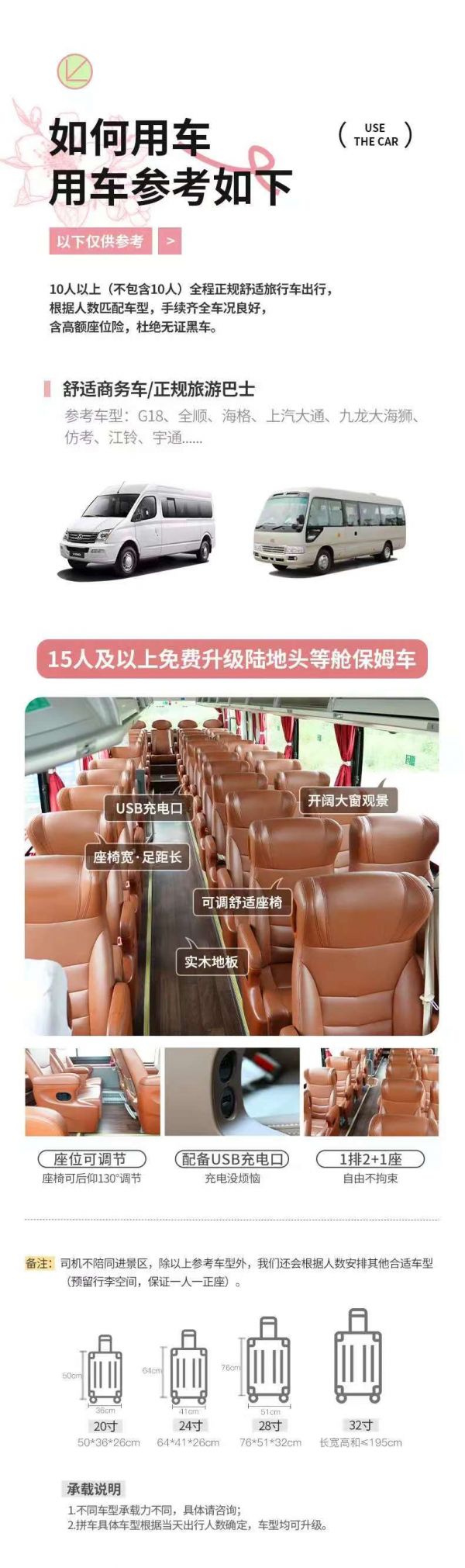 為保證成團及質(zhì)量,根據(jù)人數(shù)派不同座位數(shù)用車,保證每人一正座;