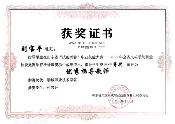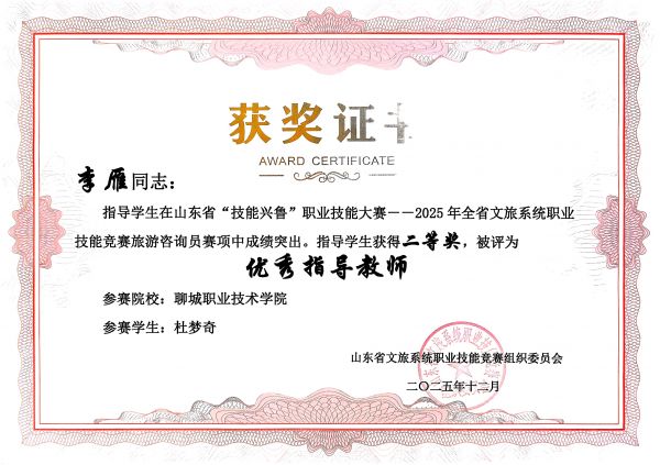 山東省“技能興魯”職業(yè)技能大賽—2025年全省文旅系統(tǒng)職業(yè)技能競賽民宿管家賽項優(yōu)秀指導老師