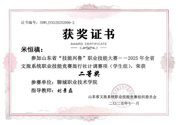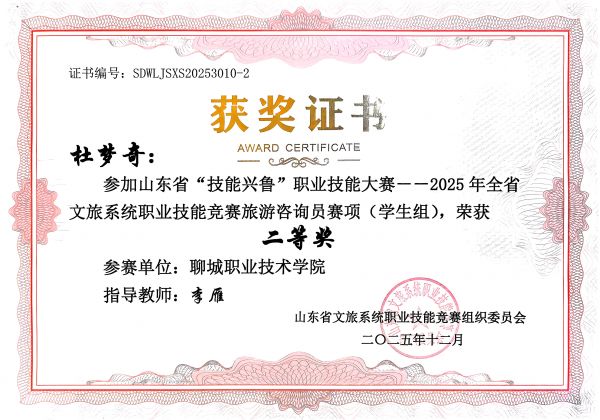 山東省“技能興魯”職業(yè)技能大賽—2025年全省文旅系統(tǒng)職業(yè)技能競賽旅行社計調(diào)賽項二等獎