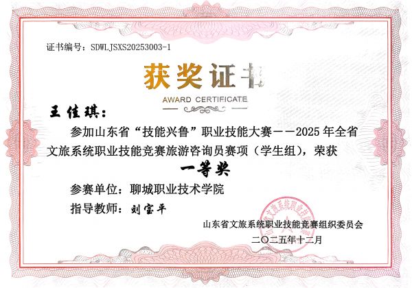 山東省“技能興魯”職業(yè)技能大賽—2025年全省文旅系統(tǒng)職業(yè)技能競賽旅行社計調(diào)賽項一等獎