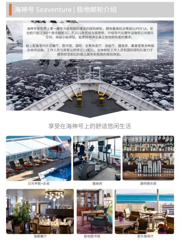 5. 海神號作為第一艘專為極地探險旅行而建造的 SUPER1A 最高抗冰等級郵輪,安全航行超過 300個南北航次,150 人最大載客量的精品小船,沖鋒艇高效全員登陸,平均陸上游覽時間業(yè)內(nèi)最長,盡興盡情親密接觸這片神奇凈土。