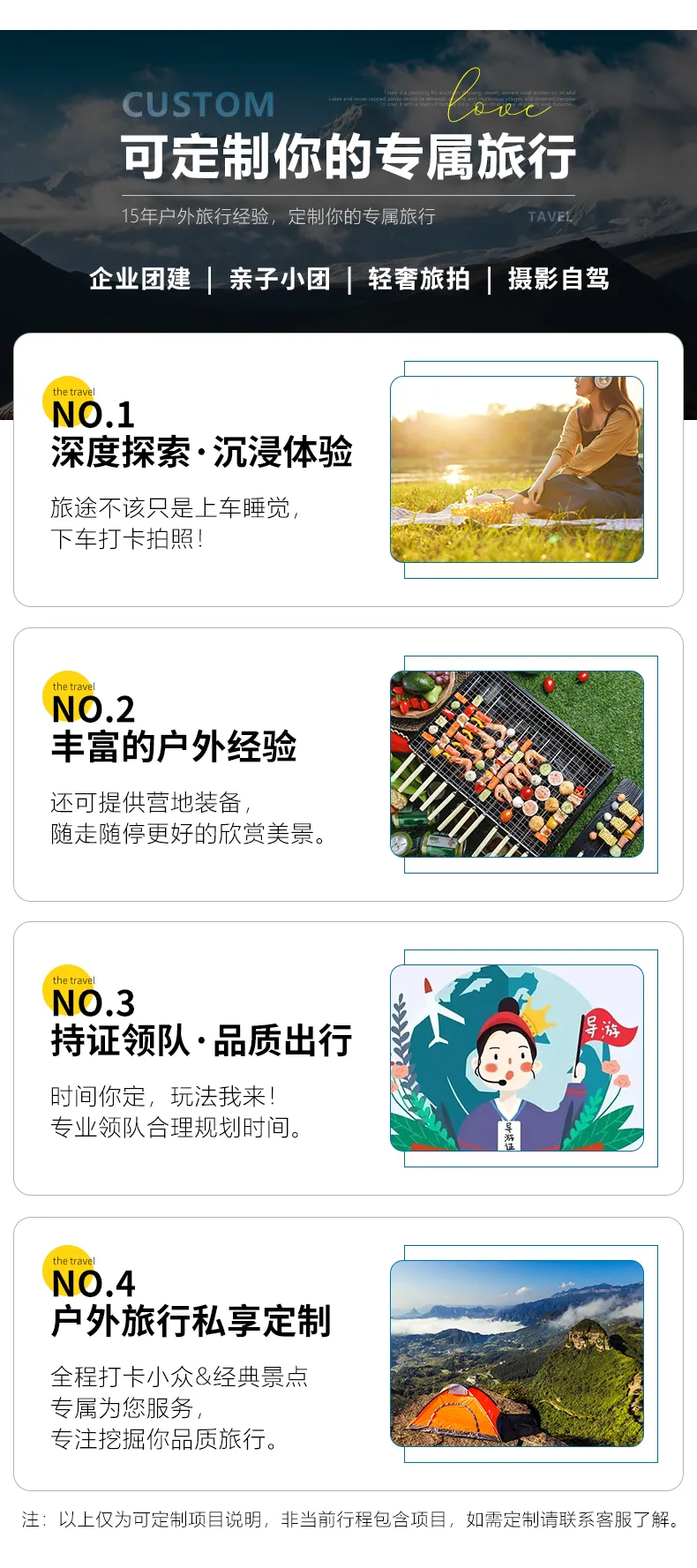私人訂制:我們業(yè)務(wù)范圍囊括了全國各大城市,川西、西北、新疆、西藏,在路上永遠(yuǎn)有我們的身影。我們將為每一個(gè)有定制需求的你策劃出獨(dú)屬于自己的完美旅行。
