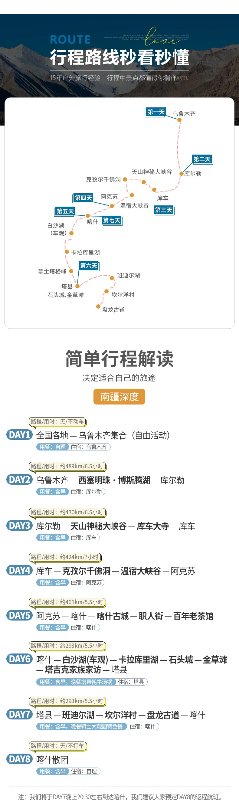 我們將于今天晚上20:30到達(dá)喀什,我們特意免費(fèi)贈(zèng)送一晚喀什酒店住宿,給您時(shí)間緩解旅途的疲憊,返程不匆忙。