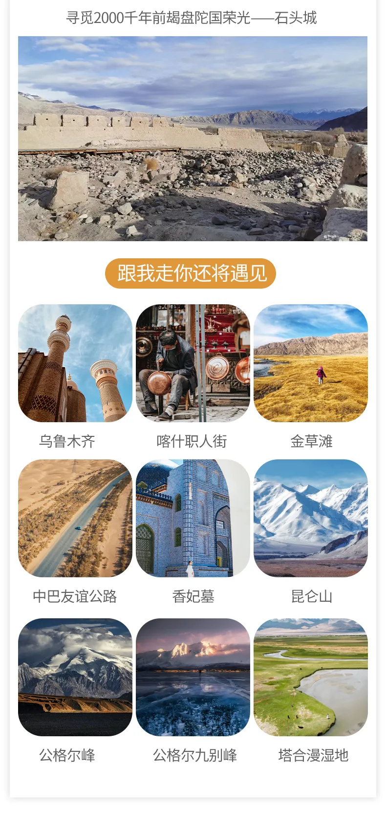 今天我們將去到中國最西部的城市—【喀什】,用整整一天的時(shí)間去領(lǐng)略這個(gè)“你未曾前往,但始終向往”的城市魅力。來喀什必須要逛逛【喀什古城】,喀什老城每天有兩個(gè)開城儀式表演,時(shí)間分別是:早晨10:30 下午18:00,向來自五湖四海的朋友們展示自己熱情的好客之道。之后我們進(jìn)入古城漫步在古城的街道,老城區(qū)街巷縱橫交錯(cuò),布局靈活多變,曲徑通幽,民居大多為土木、磚木結(jié)構(gòu),不少傳統(tǒng)民居已有上百年的歷史,是中國以伊斯蘭文化為特色的迷宮式城市街區(qū)。這里巷道狹窄彎曲,奇特的過街樓、小胡同、手工作坊隨處可見,生土建筑比比皆是,被中外游客譽(yù)為“維吾爾族活的民俗博物館”,是喀什這座中國歷史文化名城的內(nèi)涵所在。