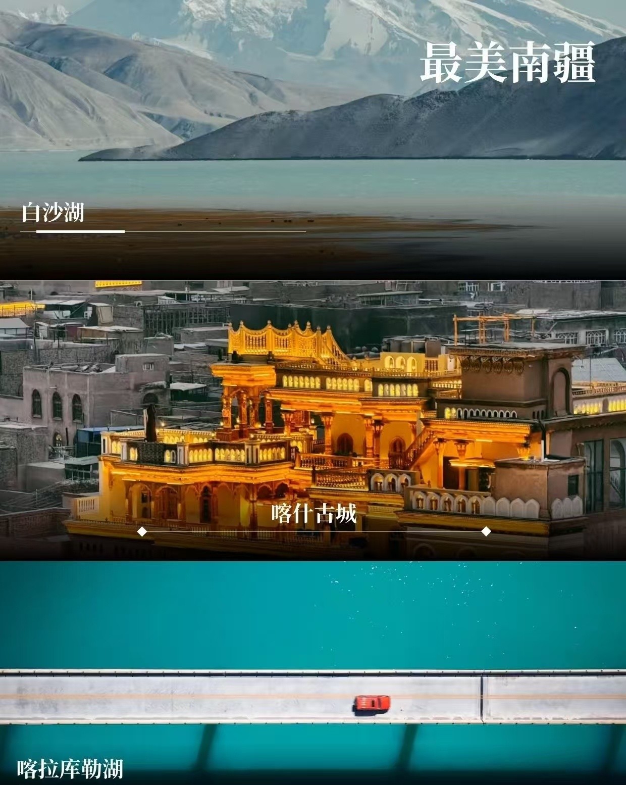 告別“東方摩洛哥”—喀什,我們將開啟一段帕米爾高原之旅。沿314國道一路暢游帕米爾高原風(fēng)光,首先驚艷我們的是背靠白色沙丘和雪山的【白沙湖】,在陽光的變化下,湖水時(shí)而呈湛藍(lán)色,時(shí)而呈綠色。更令人驚嘆的是,藍(lán)色的湖面與白沙相接,一半藍(lán)一半白,而白沙背后還有雪山。在雪山和白沙的映襯之下,白沙湖水更顯澄澈。在這里能get湖泊、白沙、雪山同框的畫面。分享一個(gè)冷知識(shí):白沙湖又名流沙河,就是西游記里唐僧收服沙和尚的地方。我們還能途觀慕士塔格峰,山頂常年皚皚白雪,猶如滿頭白發(fā),十余條冰川鑲嵌在峰體下的峽谷中,如胸前飄動(dòng)的銀須,故有“冰山之父”的美稱。隨后我們將遇見【卡拉庫里湖】,這里能看到雪山倒映在湖面的風(fēng)景,拍出來的照片特別的給人純凈的感覺。