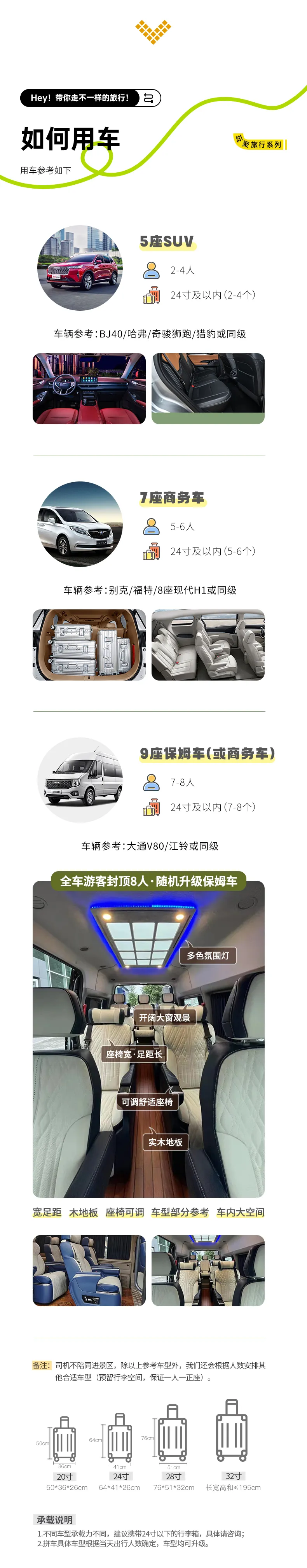 7-8位游客:乘坐9座商務(wù)車(或隨機(jī)升級9座保姆車)