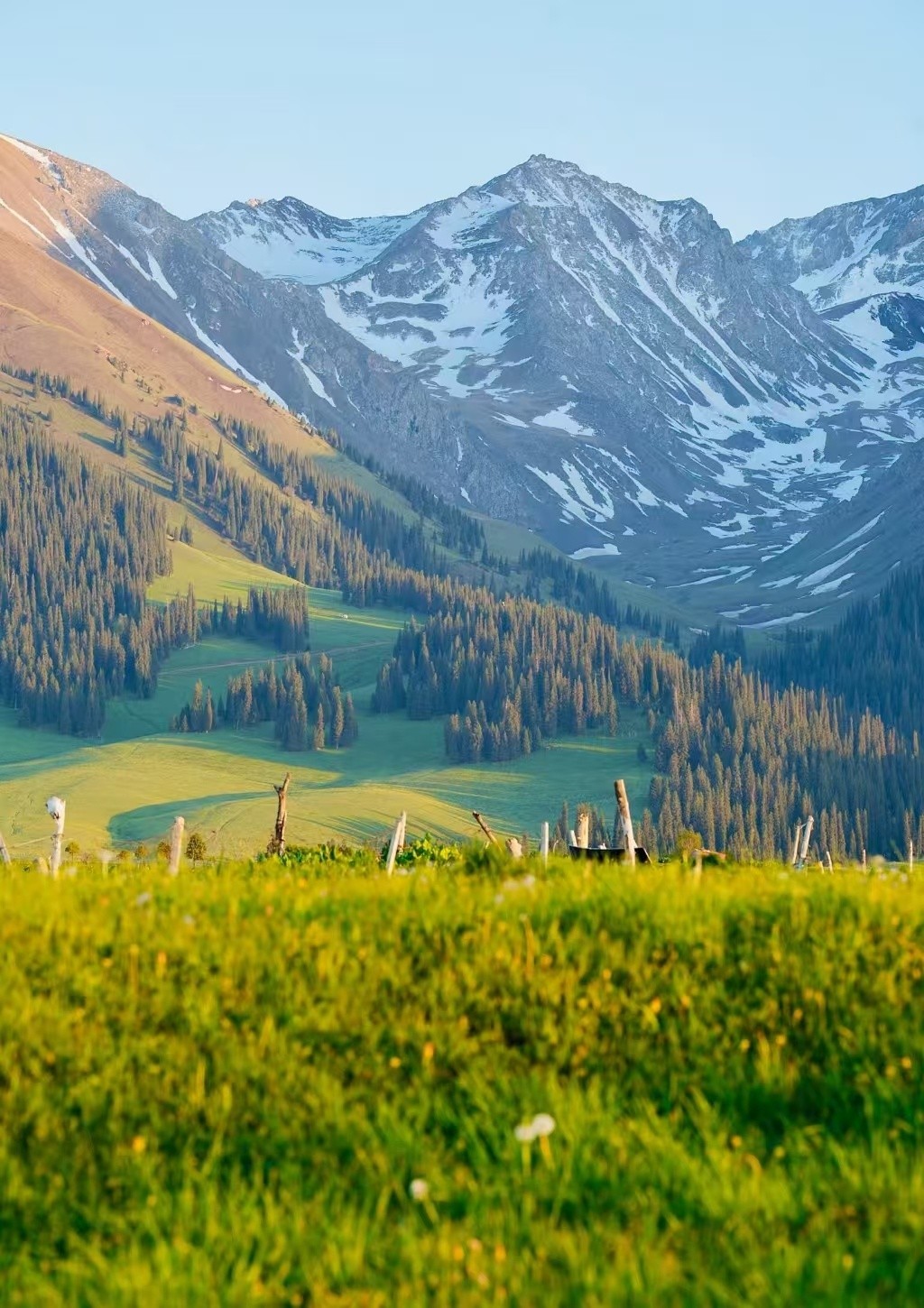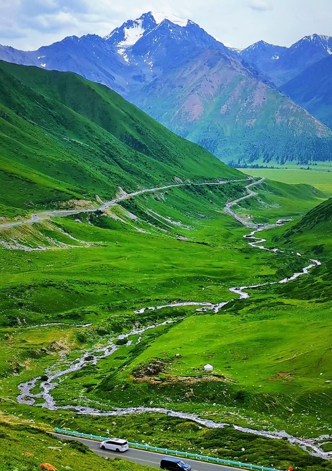 早餐后,告別連綿的草原林海,駛?cè)?strong>獨庫公路北段(僅限7座及以下車輛通行),車輪碾過的每一寸路,都是天山精心鋪就的風(fēng)光畫卷。沿途溪水湍急繞山而行,哈薩克族白氈房散落在路旁,牛羊悠然啃食青草,游牧風(fēng)情撲面而來。行至唐布拉百里畫廊,一眼望不盡的草原如綠毯鋪展,金黃野花肆意盛放,云杉林簇?fù)碇焖{(lán)色遠(yuǎn)山,喀什河谷碧水蜿蜒,雪山倒影映于水中,隨手一拍皆是媲美瑞士的風(fēng)光大片。