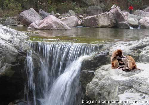 遠(yuǎn)遠(yuǎn)看到平臺(tái)就是游客們觀賞獼猴的地方。太行山獼猴屬于國(guó)家二類保護(hù)動(dòng)物,是我國(guó)華北地區(qū)唯一殘留下來(lái)的面臨來(lái)絕的靈長(zhǎng)類動(dòng)物,太行獼猴保護(hù)區(qū)是世界上獼猴分布的最北界,具有很高的欣賞價(jià)值、經(jīng)濟(jì)價(jià)值、保護(hù)價(jià)值和科學(xué)實(shí)驗(yàn)價(jià)值,被世界自然基金組織確定為具有國(guó)家和全球重要意義的A級(jí)保護(hù)區(qū)域。保護(hù)區(qū)山勢(shì)險(xiǎn)峻,林木茂密,清泉潺流,常有成群的獼猴出沒其間。獼猴共有四、五群,每群幾十只到百只不等。太行獼猴比南方獼猴個(gè)大、毛長(zhǎng)、絨厚、耐寒,而且都是雙眼皮,短尾巴,毛色光亮,形體俊美。它們性情活潑好動(dòng),愛打架嬉鬧,追逐跳躍。每群皆有猴王,各有勢(shì)力范圍。行動(dòng)時(shí),猴王率領(lǐng)哨猴在前,老、幼、母猴居中,強(qiáng)壯的雄猴在前后護(hù)衛(wèi),相互照應(yīng)。覓食或休息時(shí),哨猴在高處警衛(wèi),一有情況就大聲嘶叫,猴群隨即轉(zhuǎn)移,保證安全。正是深山風(fēng)光好,猴子自逍遙。