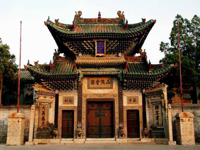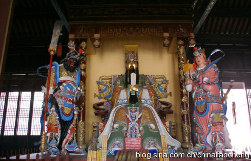 進入大殿,便可以看到三尊神像。原有的神像在解放前毀于戰(zhàn)火,現(xiàn)在的神像是1990年還原復(fù)制而成的泥塑像。中間是頭戴十二硫冕,手捧鎮(zhèn)圭,身穿龍袍的關(guān)圣帝君,兩側(cè)分別為周倉和關(guān)平。關(guān)羽生前以忠義聞名,被封為漢壽亭侯漢前將軍。死后被追封為“壯繆”侯。后來的各朝各代的皇帝希望人們學(xué)習(xí)他的忠義為自己的封建統(tǒng)治王權(quán)服務(wù),所以對關(guān)公的封號也是非常多的。有對聯(lián)寫得好“漢封侯,宋封王,明封大帝;儒稱圣,釋稱佛,道稱天尊”。從中我們不難了解,各代王朝、儒、釋、道三界對關(guān)羽的推崇到了何等高度。所以,這兒關(guān)公神像的皇帝打扮是有歷史依據(jù)的,同時也表現(xiàn)了山陜商人對他的崇拜之情。另外,在我們印象中,關(guān)羽是臥蠶眉、丹鳳眼、面如重棗的美髯公,眼前的神像卻為什么是黃臉的呢?這里呢,有一個傳說故事。