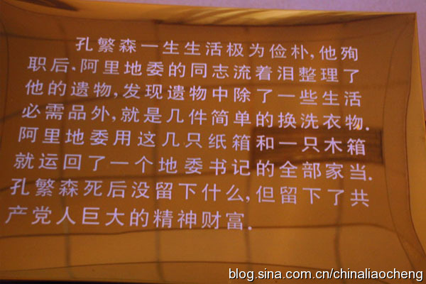 孔繁森遇難后,阿里地委在清理他的遺物時。發(fā)現(xiàn)除了一個袖珍收音機之外,就是這幾件簡單的換洗衣物,還有僅剩下的8塊6毛錢。這里擺放的,是我們根據(jù)孔繁森在阿里的生活住所,制作的一個模擬區(qū)。當時,孔繁森按照藏族同胞的生活習慣,簡單地布置了自己的住所,就是在這所房子里,孔繁森和收養(yǎng)的兩個孤兒共同度過了1年多的時間。