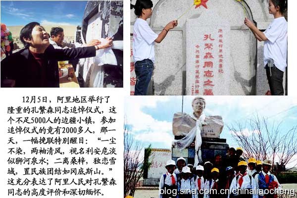 12月15日,阿里地區(qū)舉行了隆重的孔繁森同志追悼儀式,這個不足5000人的邊疆小鎮(zhèn),參加追悼儀式的竟有2000多人,那一天,一幅挽聯(lián)特別醒目:“一塵不染,兩袖清風,視名利安危淡似獅河泉水;二離桑梓,獨戀雪域,置民族團結(jié)如岡底斯山。”這充分表達了阿里人民對孔繁森同志的高度評價和深切緬懷。