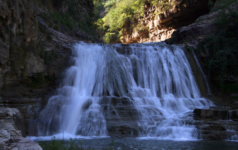 無(wú)獨(dú)有偶,再行5公里之地,又有一個(gè)天生的洗臉盆,面積三分地大,形似滴水盆,圓如規(guī)定徑。水無(wú)源,清波蕩漾;盆無(wú)蓋,一眼見(jiàn)底。當(dāng)?shù)厝藢⒌嗡枧c洗臉盆稱(chēng)為筋骨相連的子母盆。過(guò)了洗臉盆便是水簾洞。一股兩米寬的泉水從北峽溝的洞中涌出,緩流四五十米后順山崖直壁而下,一派“飛流直下三千尺”的磅礴氣勢(shì)。其后一深洞,嘩嘩瀑布落就半崖伸出的青石板上,打著飛快的漩渦卷人洞內(nèi),而后又從洞底端漏口處噴出,驚濤駭浪之聲震山蕩谷。