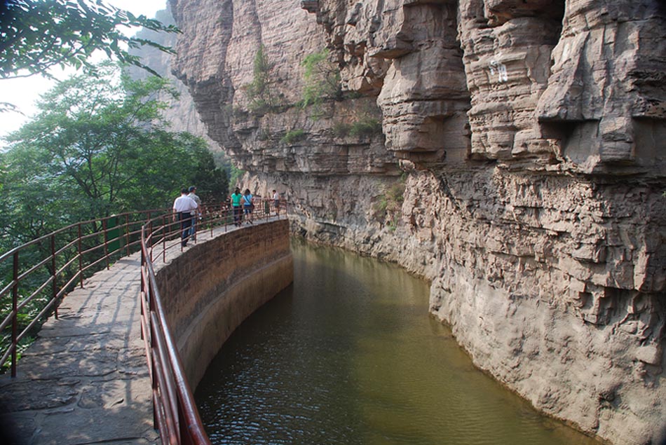 紅旗渠以濁漳河為源。渠首位于山西省平順縣石城鎮(zhèn)侯壁斷下??偢汕L(zhǎng)70.6公里,渠底寬8米,渠墻高4.3米,縱坡為1/8000,設(shè)計(jì)加大流量23秒立方米,全部開鑿在峰巒迭嶂的太行山腰,工程艱險(xiǎn)。