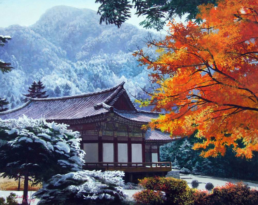 在散珠和龍淵兩大瀑布飛瀉的巖盤上,坐落著著名的上元庵。此庵建于高麗時(shí)期(公元918~1392 年),后遭毀壞,現(xiàn)在的這座老廟是1580 年重建的。庵內(nèi)有一棵盤根錯(cuò)節(jié)的老菩提樹(shù),樹(shù)旁有一塊打糕石,東邊近處豎立著一塊龍角石。上元庵樓臺(tái)殿閣,古樸幽雅,與周圍的自然景色十分和諧。