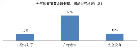 距2015年春節(jié)黃金周假期只有1個多月了,調(diào)查顯示,有出行意愿的網(wǎng)民達到八成。17%的網(wǎng)民已經(jīng)訂好了出游計劃,65%的網(wǎng)民仍在考慮中。18%的客戶表示沒有出游計劃。