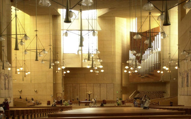 教堂占地二千余平方尺,頂部為鐘樓。禮堂高大寬敞,可容二百多教友同時參加儀式;圣壇上置圣母像,據(jù)說是從歐洲運來;其兩側(cè)有數(shù)尺高的天使像,造型栩栩如生,是為紀念建堂百周年而置。