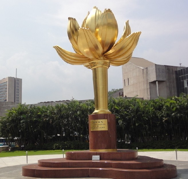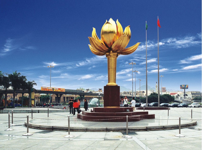 主體部分由花莖、花瓣和花芯組成,青銅鑄造,表面貼金裝飾,形似蓮葉的基座部分則由二十三塊紅色花崗巖相疊組成,寓意澳門三島。蓮花是澳門特別行政區(qū)區(qū)花,蓮花盛開(kāi)、亭亭玉立、冉冉升騰,象征澳門永遠(yuǎn)繁榮昌盛。