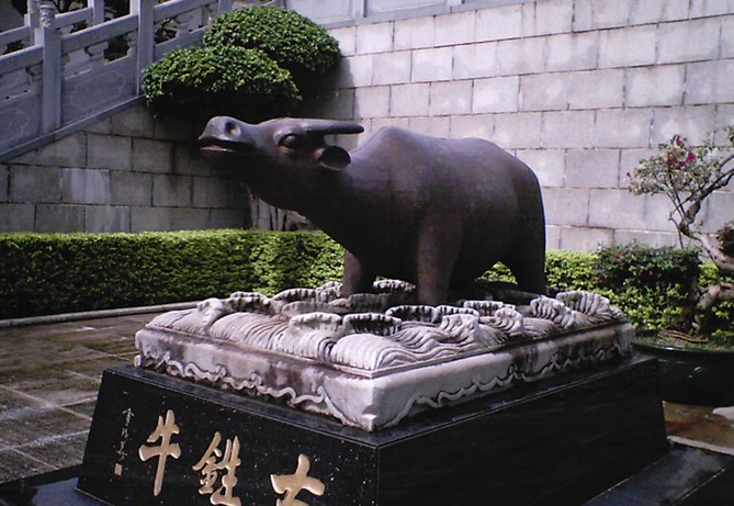 入口是一座聳立的大石牌坊,三門歇山頂建筑,高16米,氣勢恢宏磅礴,正中題“東粵菁華”,兩側(cè)分別書有“金聲”“玉振”,皆是國學(xué)大師饒宗頤先生的手跡。牌坊到正殿是三進(jìn)石階,院內(nèi)花圃簇?fù)碇竦镊梓?、青獅、盤龍及鐵牛等吉祥物。