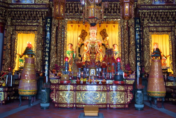 天后宮大殿同樣是木石結(jié)構(gòu),金黃色琉璃瓦屋面配以閩南式燕尾大脊,脊頂以彩瓷塑“雙龍朝寶塔”,飛檐有各色堆剪和卷草花飾,殿前臺明正面砌六幅青石浮雕,踏步中部嵌一幅“九龍勝云”浮雕御路石,整座大殿外觀氣勢恢宏。版權(quán)所有山東聊城聊之旅國際旅行社有限公司,轉(zhuǎn)載必究!大殿前廊八根圓形透雕青石大龍柱及大量石雕,絳紅色榔扇門窗,繪有大量寓意喜祥如意的圖案。大殿梁柱間的大部分彩繪以媽祖故事為主題,描金厚彩,富麗堂皇。殿內(nèi)供奉一尊高三點(diǎn)八米、寬二點(diǎn)一米的媽祖坐像。