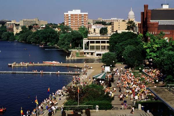 至于威斯康辛麥迪遜校區(qū)的校園環(huán)境,更是一等一的好。在鄰近威斯康辛州首都的市中心,有一個(gè)相當(dāng)有名的曼多塔湖(Lake Mendota),而靠著這個(gè)湖畔一千英畝的地方,就是美國(guó)最杰出的大學(xué)校園─威斯康辛大學(xué)麥迪遜校區(qū)。每年威大都會(huì)在曼多塔湖舉辦各項(xiàng)運(yùn)動(dòng)競(jìng)賽,也有不少學(xué)生在湖畔進(jìn)行社團(tuán)活動(dòng)或是小團(tuán)體的聚會(huì),但大多數(shù)都是大學(xué)部的學(xué)生。不過(guò)曼多塔湖的確是所有就讀威斯康辛大學(xué)麥迪遜校區(qū)的學(xué)生最美好的一個(gè)回憶,在入學(xué)時(shí)和畢業(yè)后,才能有心情好好的欣賞這片美景,也算是威大學(xué)生的幸福。