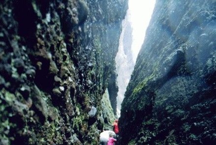 一閘險一閘,閘閘景不同。水井入谷口處,為“一道閘”。南北山崖壁立,谷底難容一足,眼前是一層樓高的“天梯”通道。出了“一道閘”,抬頭仰望南面半山崖有一處月牙形的龐然大洞;拾級而上,一個能容千人的石洞,常年干爽明亮、冬暖夏涼,這里被人們稱為“石窟王宮”。進(jìn)入“二道閘”,它比起“一道閘”更加窄長、更加險峻。剛才是陽光明媚,轉(zhuǎn)眼間便是天昏地暗。抬頭便可望見兩崖?lián)翁欤闶侵摹耙痪€天”景觀。天設(shè)地造,極其美妙。在閘內(nèi)可以看見南面懸崖上飛濺出一道高約50米、寬5米的“水簾”,似乎向攀巖者彈奏出歡快的迎賓曲?!叭篱l”上下約有三層樓高,人們無處落腳,比黃山的“鯽魚背”更險一籌。身后是萬丈深淵,腳下峭壁陰森,穿過小水潭,隱約能看到懸崖峭壁之間有一條縫隙,其名“地縫”,循著人工開鑿的石凹,手腳并用往上攀爬,進(jìn)入谷內(nèi),有一種豁然開朗的感覺,攀上谷口時,不妨回頭細(xì)看兩石壁上閘痕清晰可辨,谷內(nèi)就是古時的避王巖。