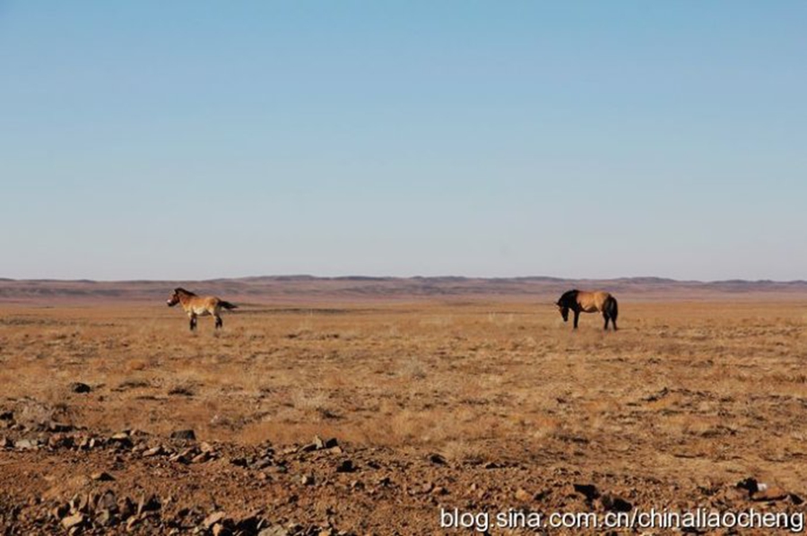 遙望遠(yuǎn)處,兩匹野馬在一望無垠的曠野上悠閑的吃草···國寶??!