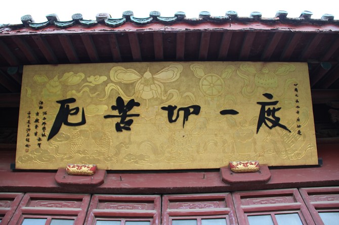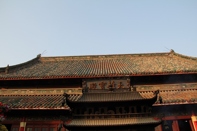 大雄寶殿重檐斗拱,雕梁畫揀,金碧交輝,其內(nèi)供奉有釋迦摩尼、阿彌陀佛和藥師佛三世佛,均高一丈三尺,其后是大型雕塑海島觀音,取材于《華嚴(yán)經(jīng)》善財(cái)童子53參的故事,形象地表現(xiàn)出南海觀音普渡眾生的場(chǎng)面,東西兩壁供奉的是十八羅漢。
