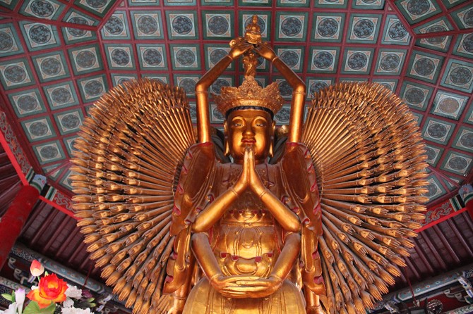 羅漢殿中間,有一木結(jié)構(gòu)八角亭高高聳立,內(nèi)有一尊四面千手千眼觀音木雕像,高6.6米,獨(dú)一無二,是在乾隆年間,由藝術(shù)巨匠用一株白果樹雕刻而成,這名巨匠大約在28歲時(shí)開工,在80多歲時(shí)才完工,傾注了自己的全部。
